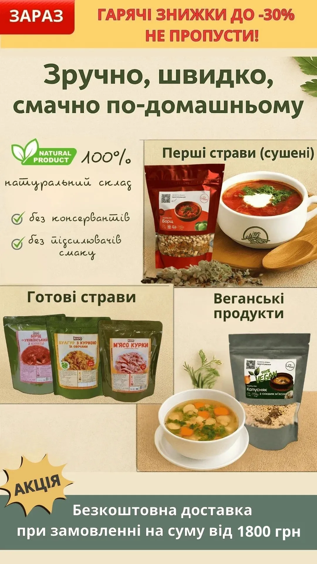 Беру тут сушені та готові страви вже не перший раз. Завжди все свіже і смачне. Тепер навіть борщ можу сам зварити!